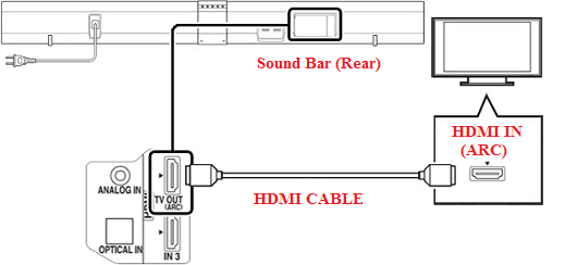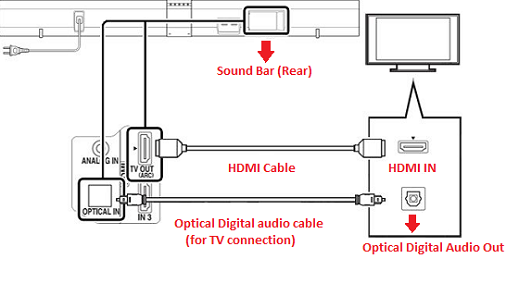 - If the TV has no ARC label on its HDMI ports, connect the HDMI cable to any HDMI ports on the TV and to the HDMI OUT (ARC) on the home theatre system or home audio system. Then connect an optical cable to the optical output port of the TV and the DIGITAL IN (TV) port on the home theatre system or home audio system.